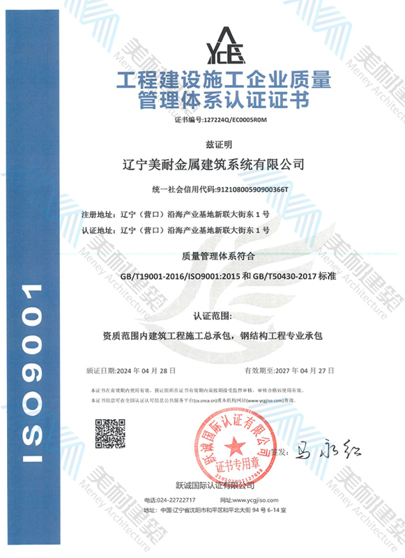 遼寧美耐金屬建筑系統(tǒng)有限公司位于遼寧(營(yíng)口)沿海產(chǎn)業(yè)基地,專(zhuān)注于預(yù)制金屬建筑系統(tǒng)領(lǐng)域,是一家集工業(yè)建筑設(shè)計(jì)、制作、施工及相關(guān)的技術(shù)咨詢(xún)與服務(wù)為一體的綜合性服務(wù)企業(yè)。作為國(guó)家鋼結(jié)構(gòu)協(xié)會(huì)會(huì)員、中國(guó)建筑金屬結(jié)構(gòu)協(xié)會(huì)會(huì)員單位與國(guó)家高新技術(shù)企業(yè),美耐建筑集建筑工程施工總承包、鋼結(jié)構(gòu)工程專(zhuān)業(yè)承包等多種資質(zhì)于一身,并擁有22項(xiàng)鋼結(jié)構(gòu)建筑領(lǐng)域?qū)@?項(xiàng)軟件著作權(quán)。